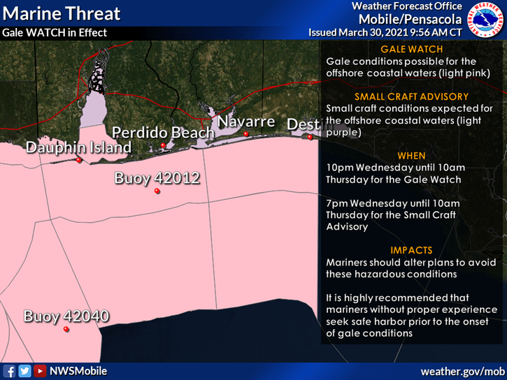 A Gale Watch is in effect from 10 PM CDT Wednesday through 10 AM CDT Thursday for frequent wind gusts to 40kts over Mississippi Sound, Southern Mobile Bay, and offshore waters out to 60NM. A Small Craft Advisory is in effect for the rest of the Bays and Sounds from 7 PM CDT Wednesday through 10 AM CDT Thursday. Small Craft conditions will likely extend past this timeframe for all bays, sounds, and offshore zones and will have to be monitored for extensions in time. Mariners should Exercise Caution and plan to seek safe harbor prior to the onset of gale conditions.
